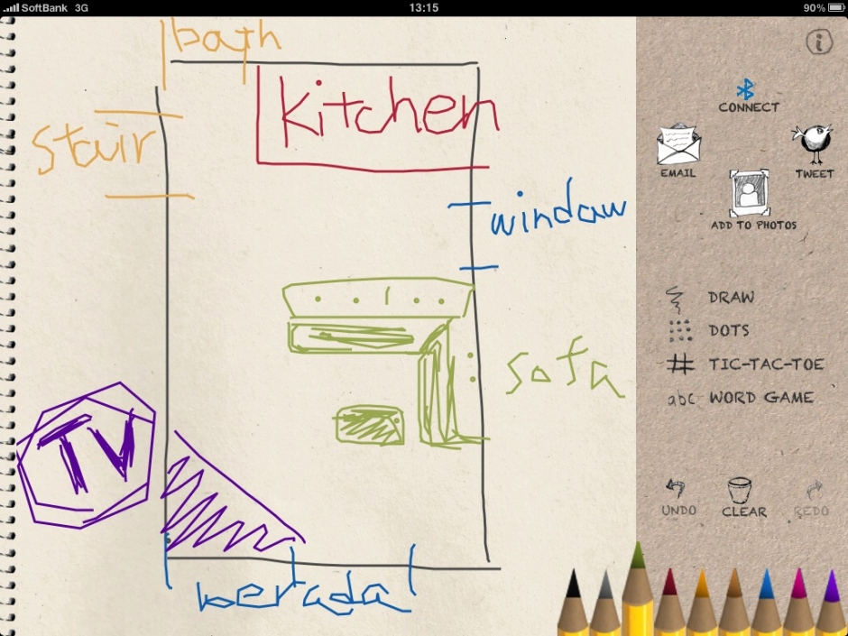 そこでiPadを試しに使ってみました。結果は期待以上の成果。左のような図をiPadに書きながら、部屋のイメージを共有して相談できました。採寸も無いままに...。