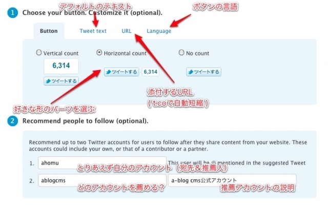 上に示したURLへ行くと、Tweet Buttonを簡単に作成するためのフォームが表示されます。適当にやっても作成できますが、一応簡単な説明を画像に載せてあります。