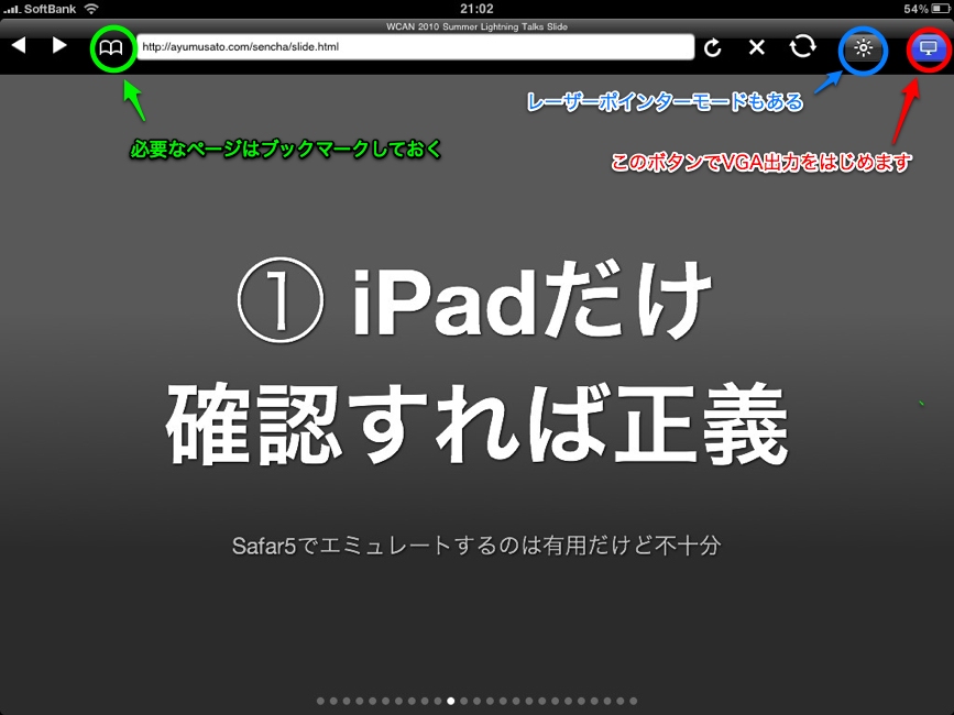 先日の、WCAN 2010 Summer のライトニングトークで、iPad使って喋ってきました。iPadでプレゼンとかナウい上に、悪目立ちできそうなので挑戦してみた次第。