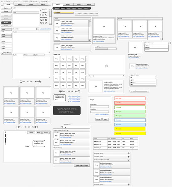 SimpleWireFrame - Graffletopia : Webページの機能的なパーツが豊富なステンシルです。最小限の飾り気がザックリ組むのにちょうどいい印象です。