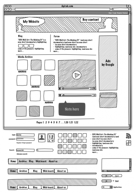 Web Sketch Interface - Graffletopia : ラフな印象で作れるペーパープロト調のステンシルです。機能というよりは全体のレイアウト的な構成です。