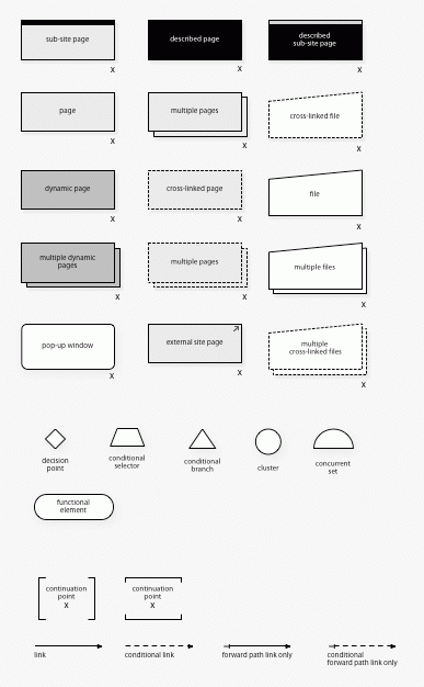 Information Architecture - Graffletopia : IAと書いてありますが、つまりサイトマップ用のステンシルです。サイト内コンテンツの構造や関係性を図示するのに役立ちそうです。
