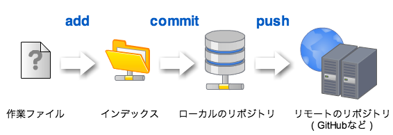 Gitでは、ローカルの変更を、GitHubなどのリモートの公開リポジトリに反映するには、このような流れをとります。ローカルでリポジトリを運用するだけであれば、pushは必要ありません。