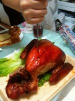 巣に持ち帰って二人がかりで食べたわけですが、足を2本、手を1本、さらに胴体を切り裂いて食べたあたりでギブアップ。京都から帰るまで冷蔵庫で寝てました。その後、包丁によって真っ二つに分断されて、それぞれの実家にお持ち帰りされましたとさ。