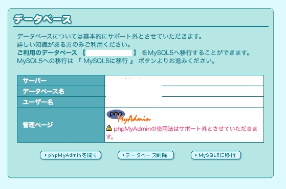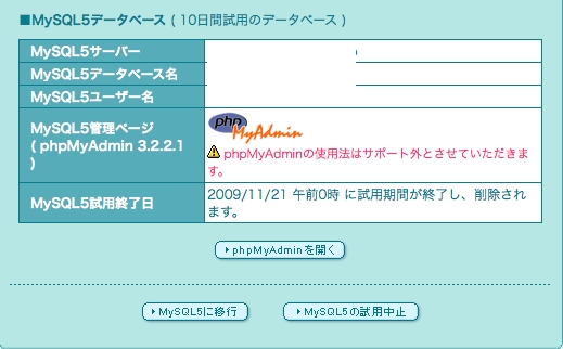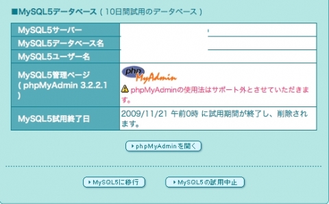 移行直後は、こんな感じで試用扱いです。この移行期間中に、MySQL5で使っているソフトが動作するかどうかを確認します。問題がなければMySQL5に移行ってのをポチッと。